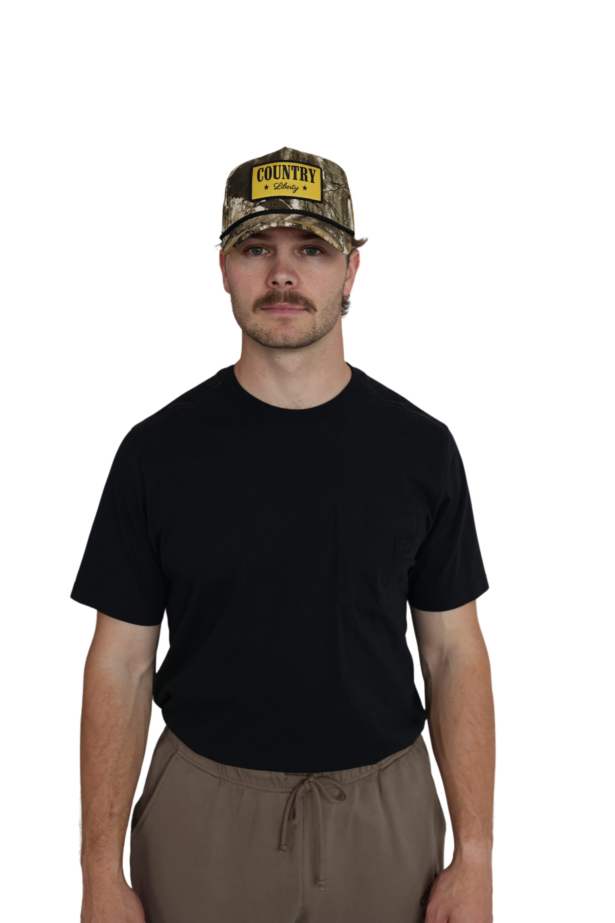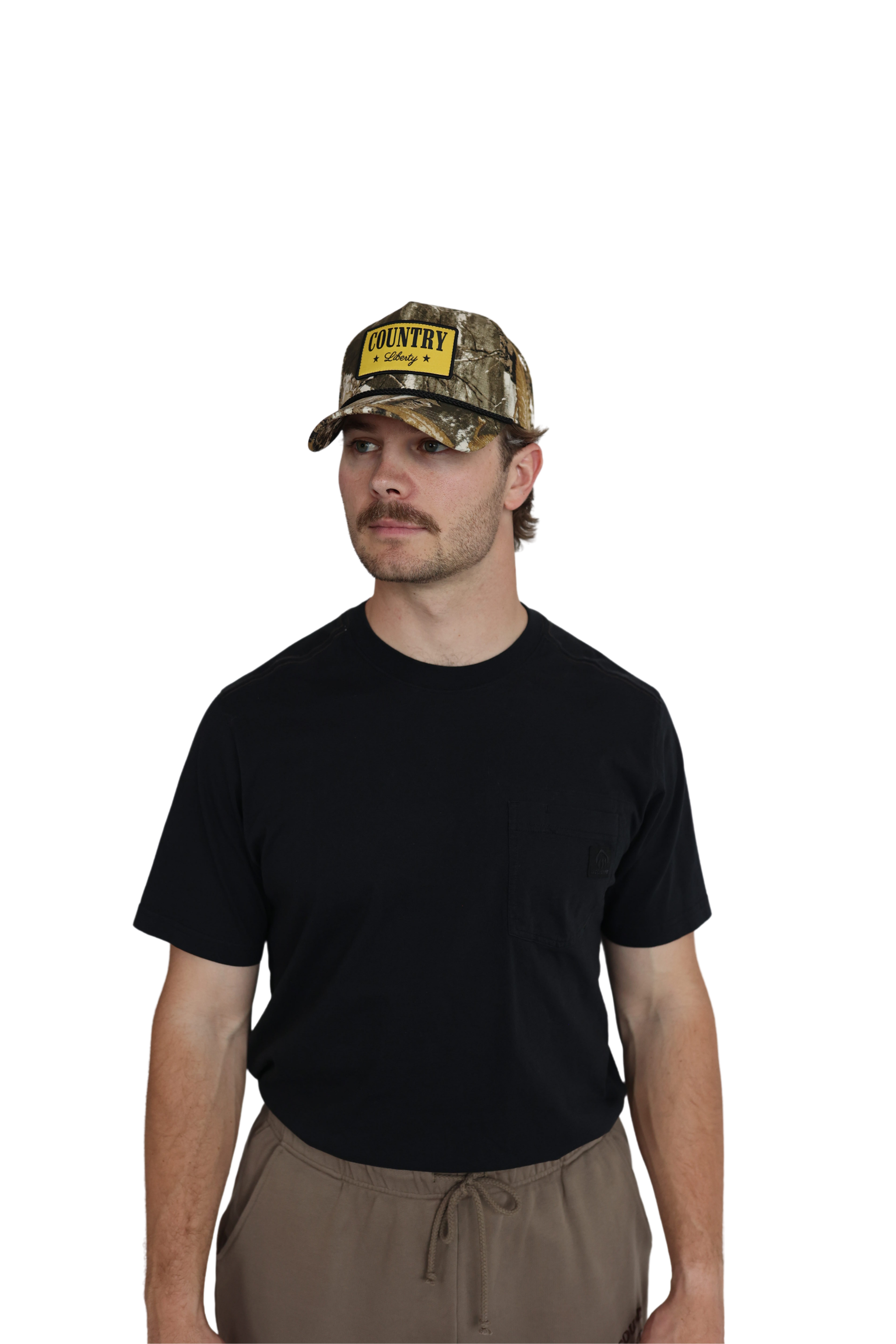 A new staple for summer — rugged, loud, and built to stand out. This all-over camo rope cap features a bold Country Liberty patch, inspired by classic gas station hats and roadside dives. Whether you're in the bush or on the barstool, this one brings the grit.