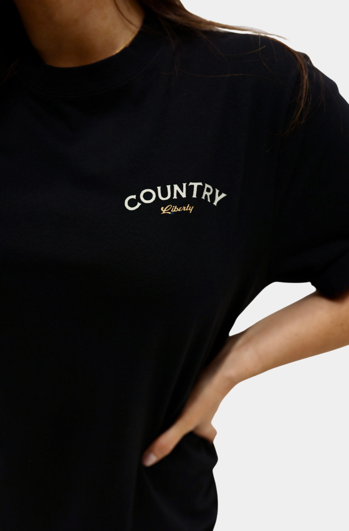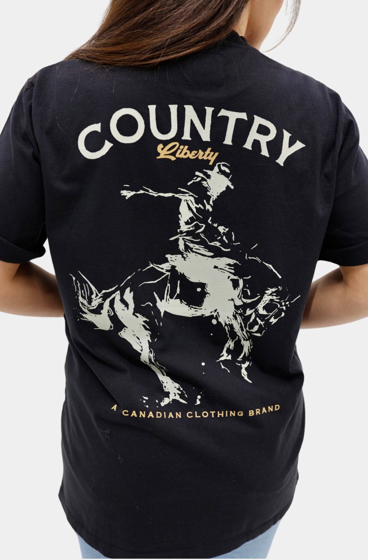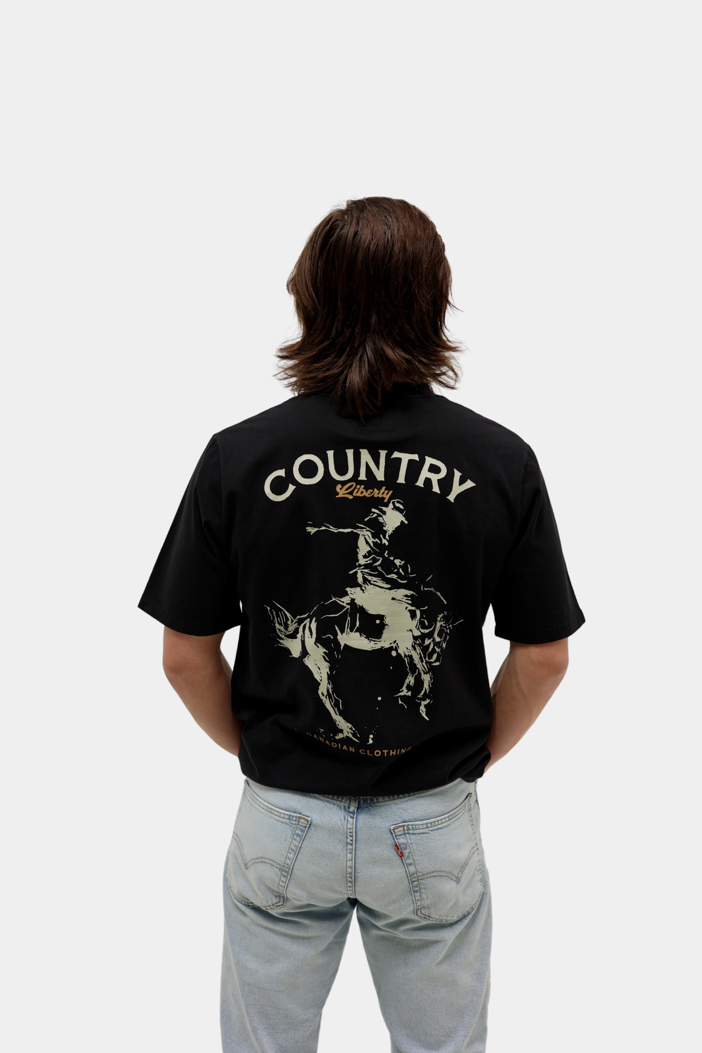 This all-black shirt throws it back with a powerful cream bronc print across the back and “country liberty” stitched above the action. Worn-in feel, rodeo-ready energy.