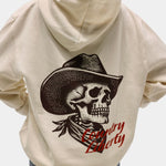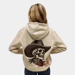 Unleash your rebellious spirit with this eye-catching cream hoodie showcasing a detailed cowboy skull graphic that radiates pure outlaw attitude. Perfect for throwing on during chilly festival nights or late-night adventures when you need that extra layer without sacrificing your bold style. The cozy hood and striking back design bring edge to any look.