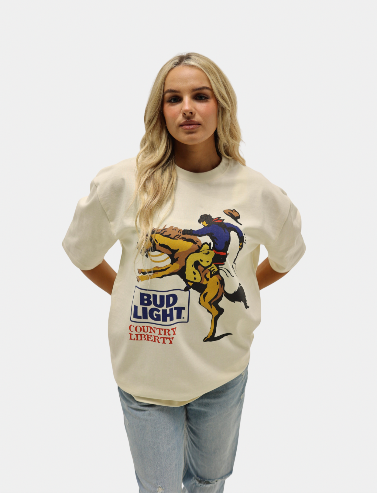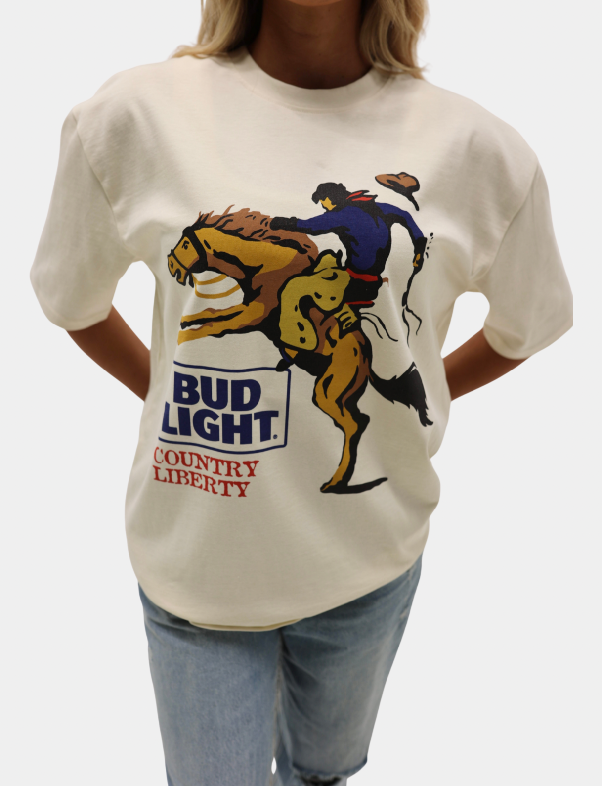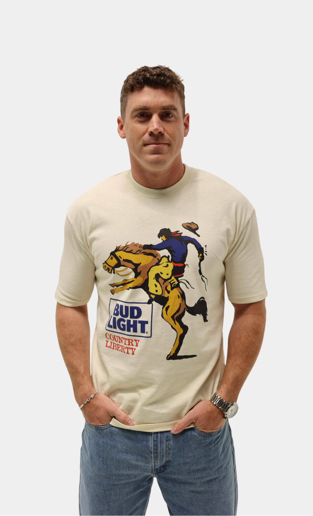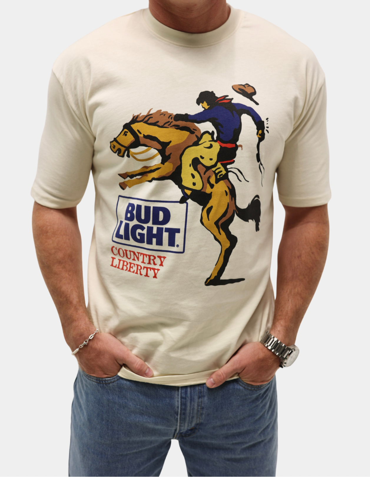 The Bud Light Country Liberty Tee offers a clean, vintage western look with a touch of beer heritage. Soft and comfortable, it’s made for those who appreciate both the rodeo and a well-earned drink.