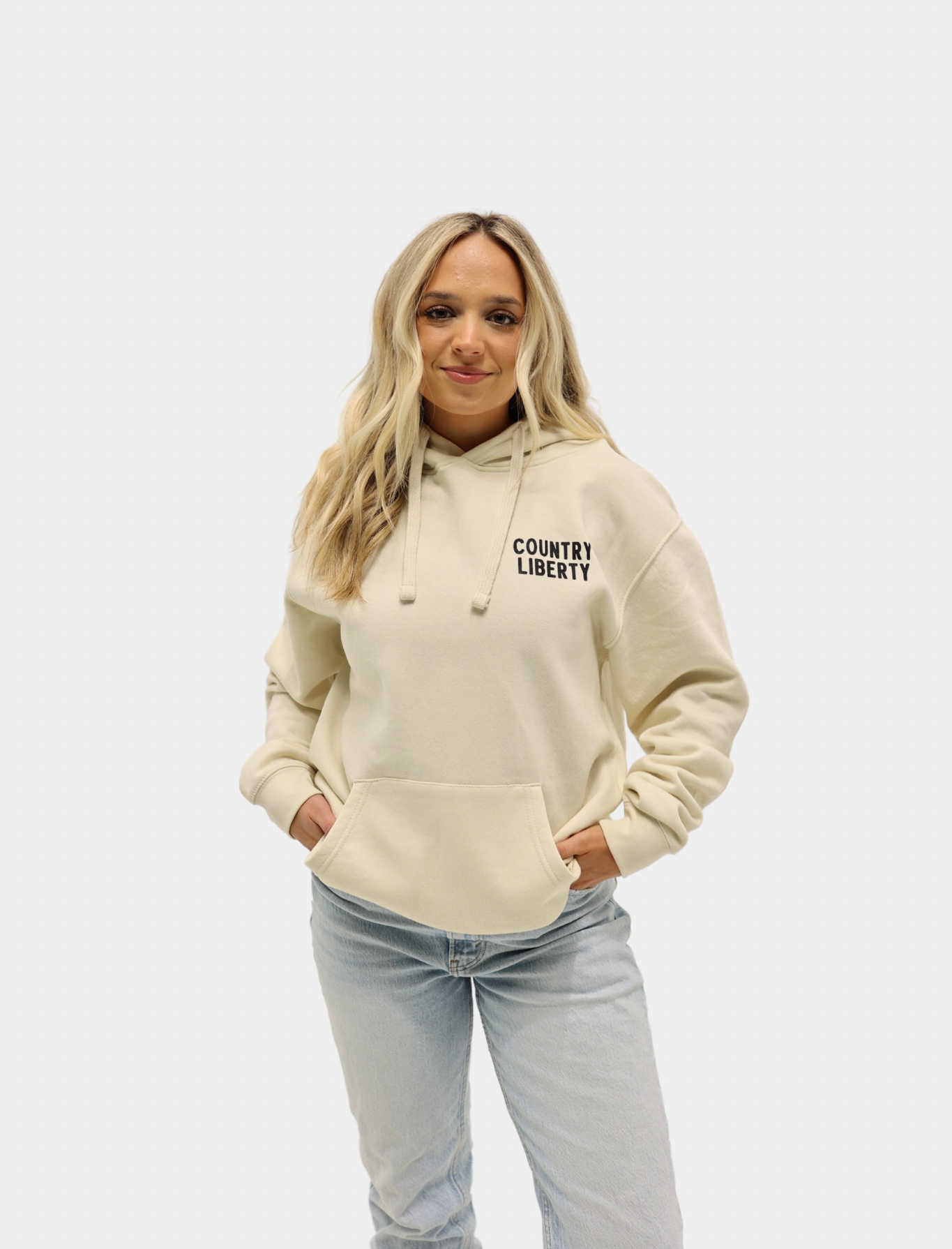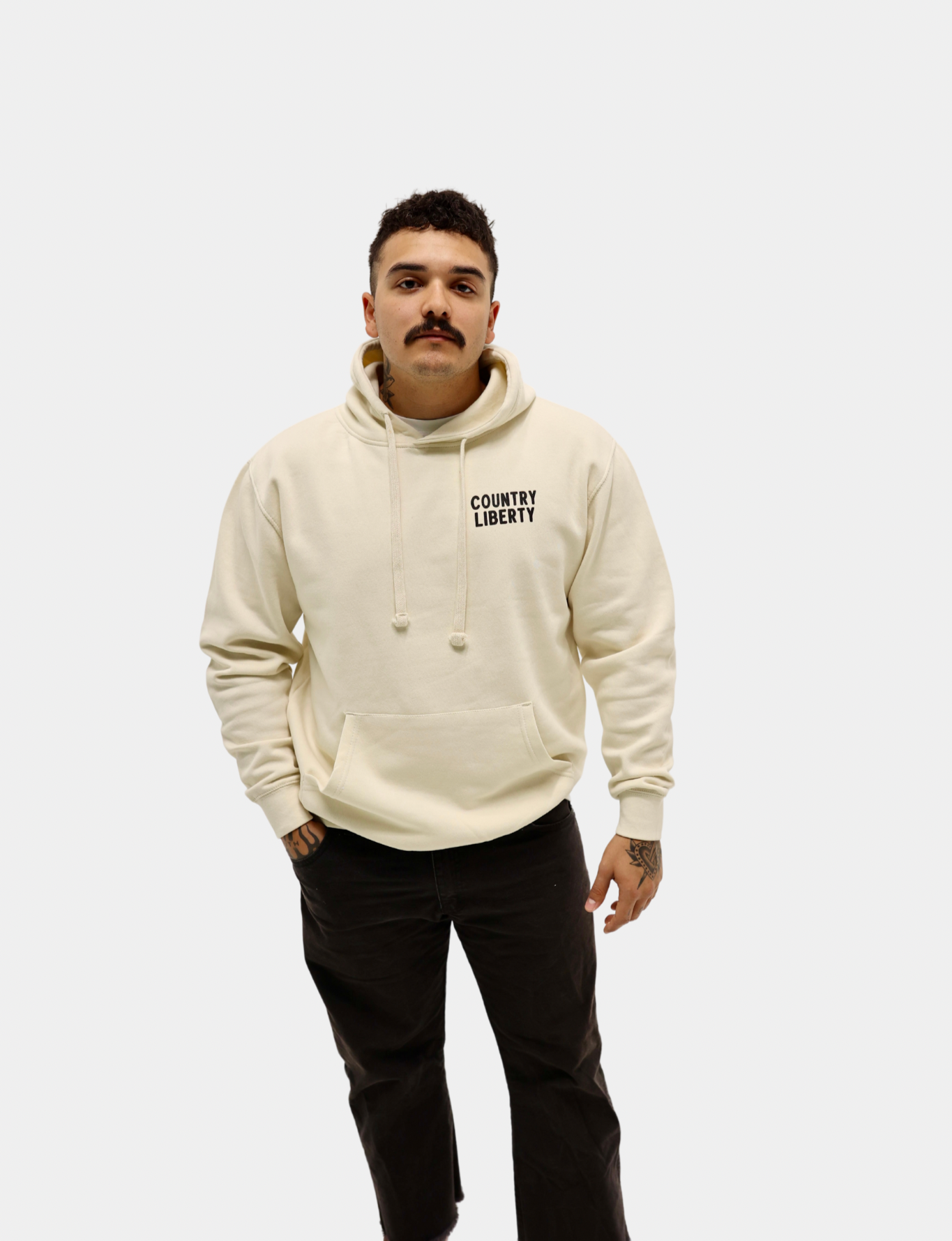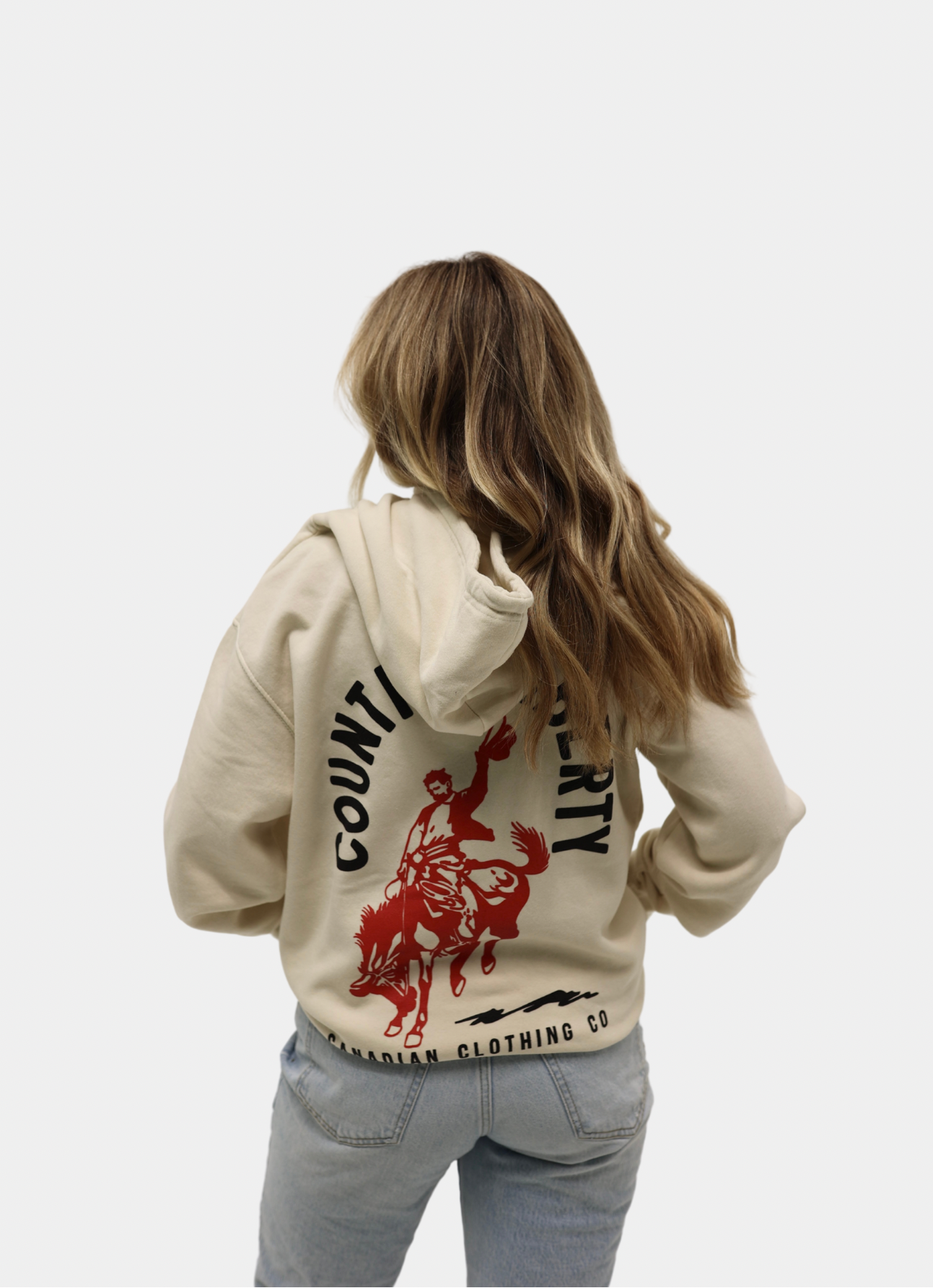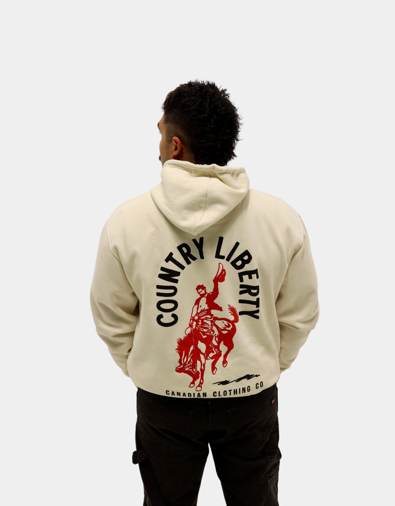 This natural fleece hoodie features a full-size bronc rider in bright red, framed by "country liberty" across the back and "Canadian Clothing Co" underneath. Built for statement-makers, day-ones, and those who live it loud.