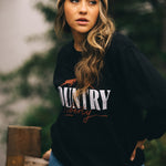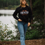 Perfect for festival season, this vintage inspired black crewneck features country-themed lettering and a worn in feel. A go-to piece for anyone who likes their festival gear with a bit of old-school character.