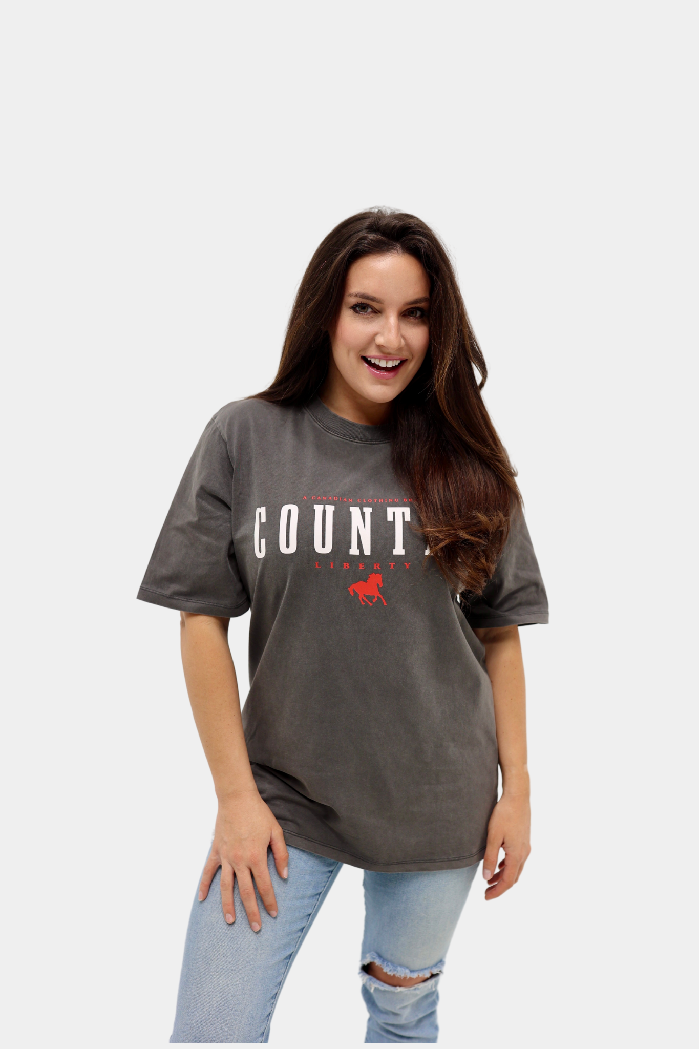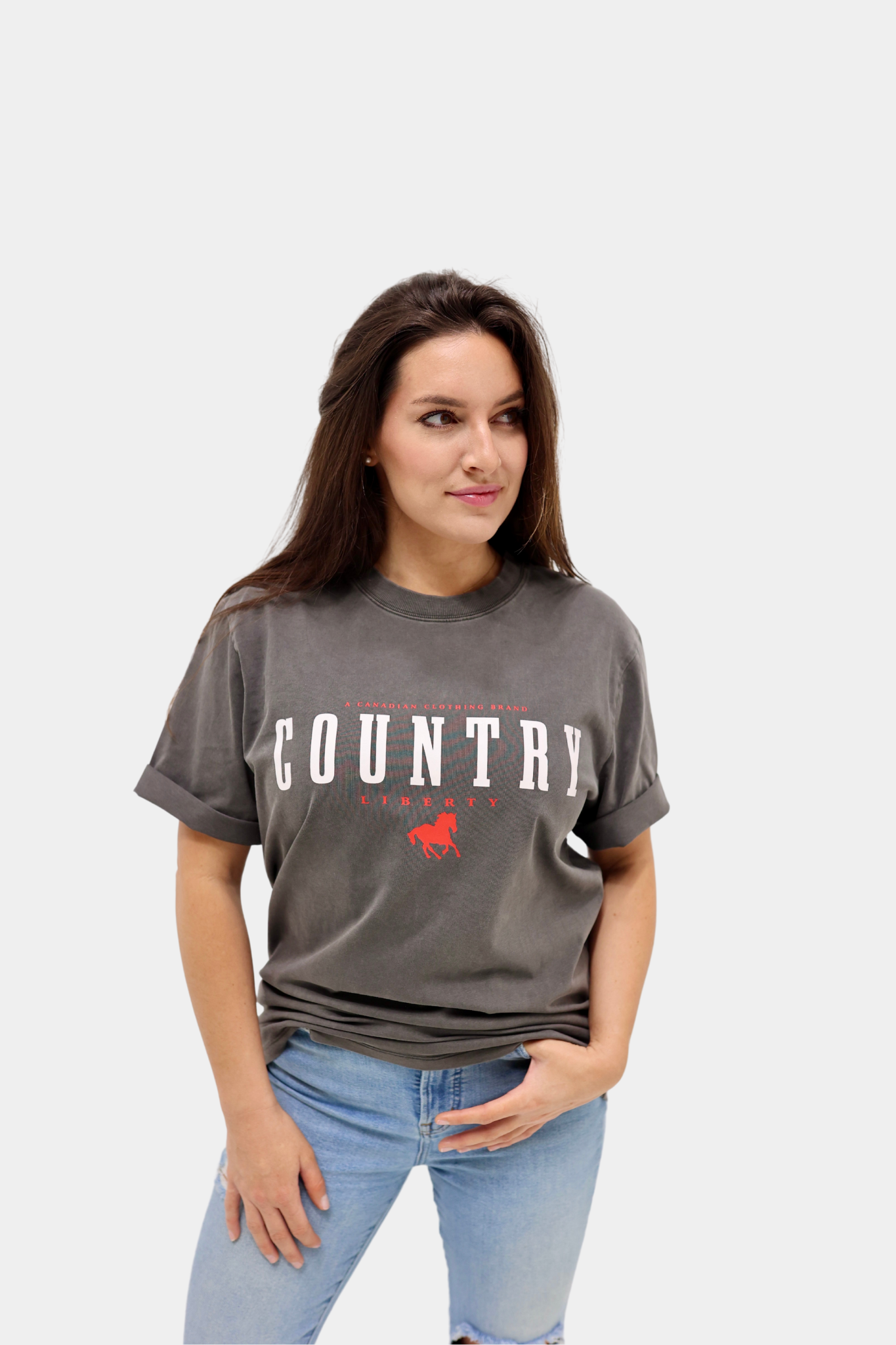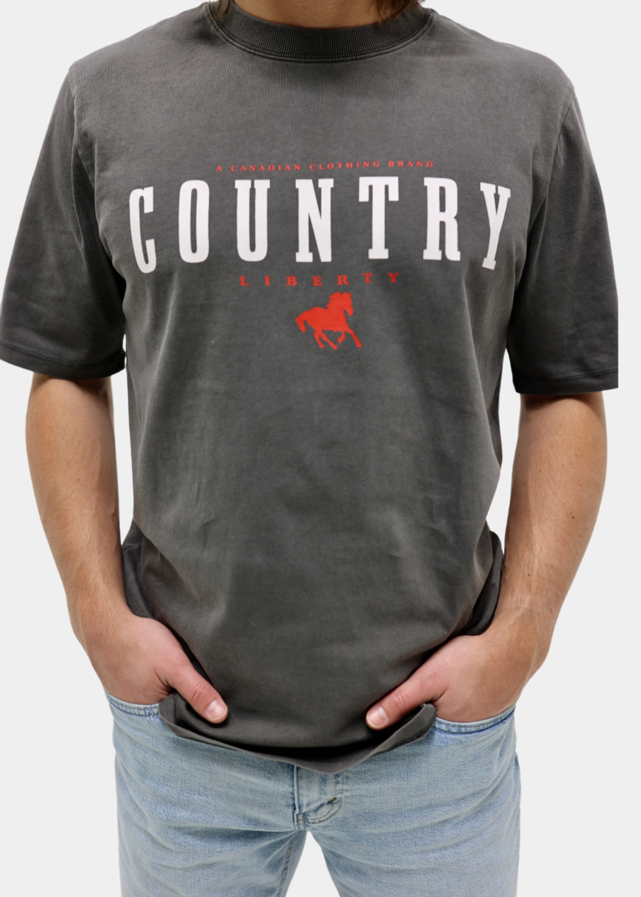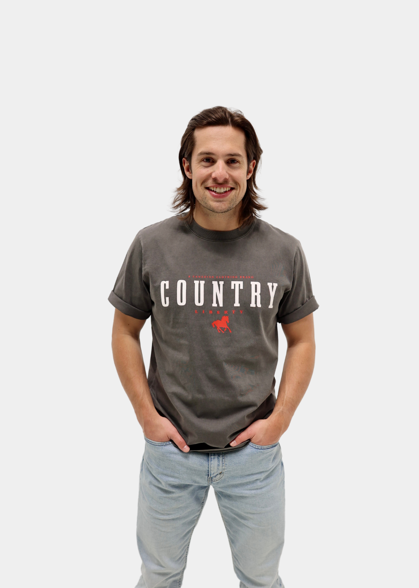 Faded charcoal cotton with a clean country liberty front hit and red graphic stamp. From rodeo nights to highway drives — this one’s made for the long haul.