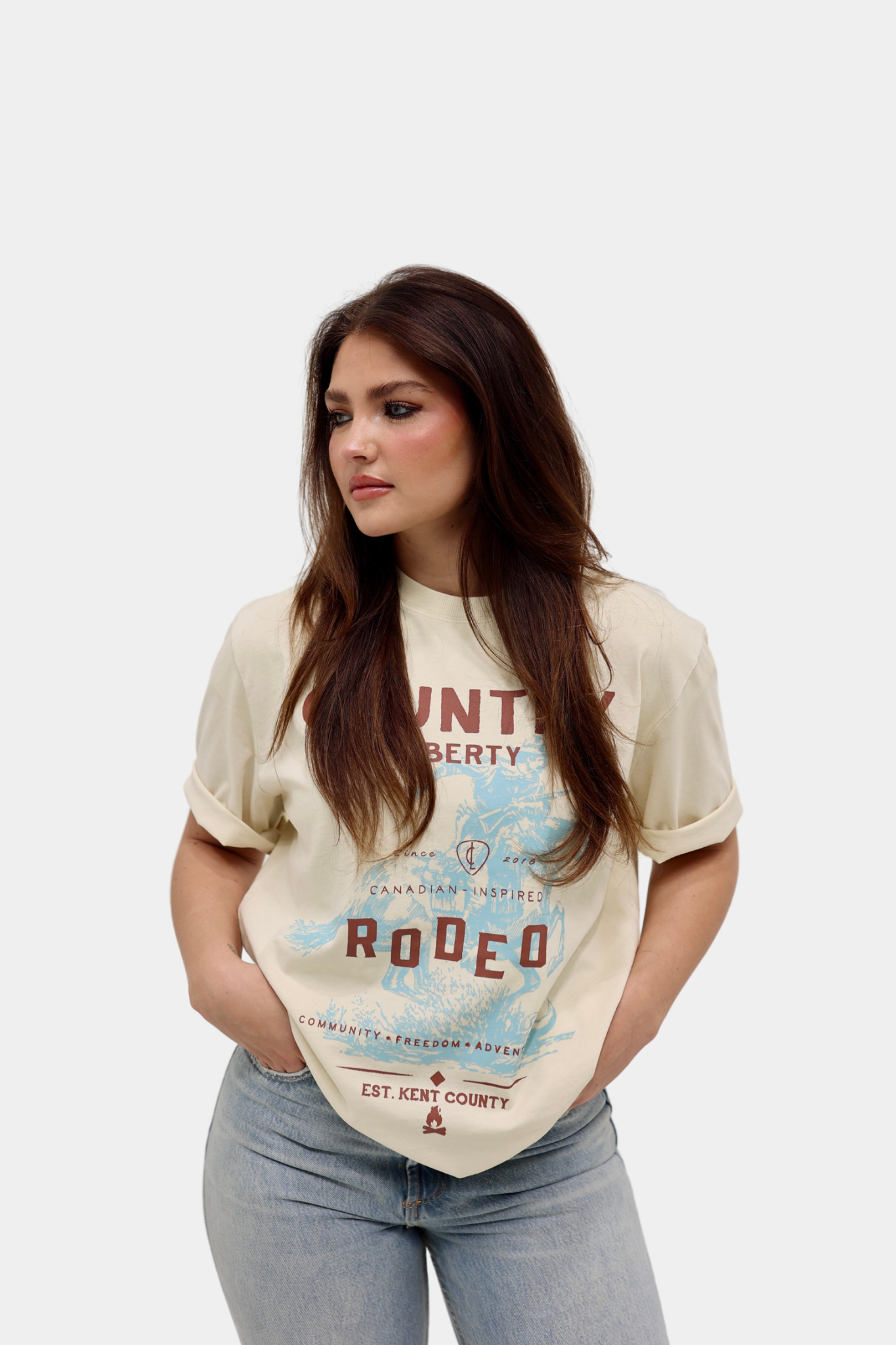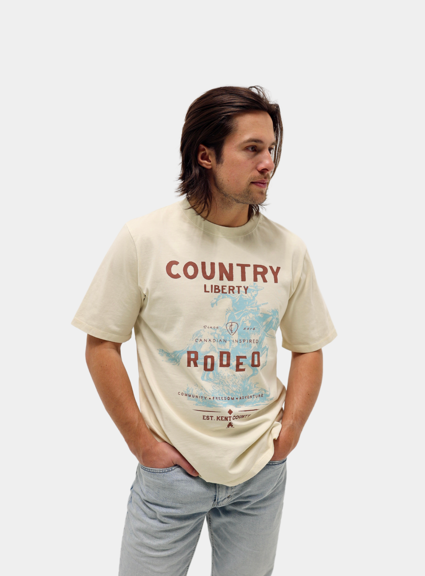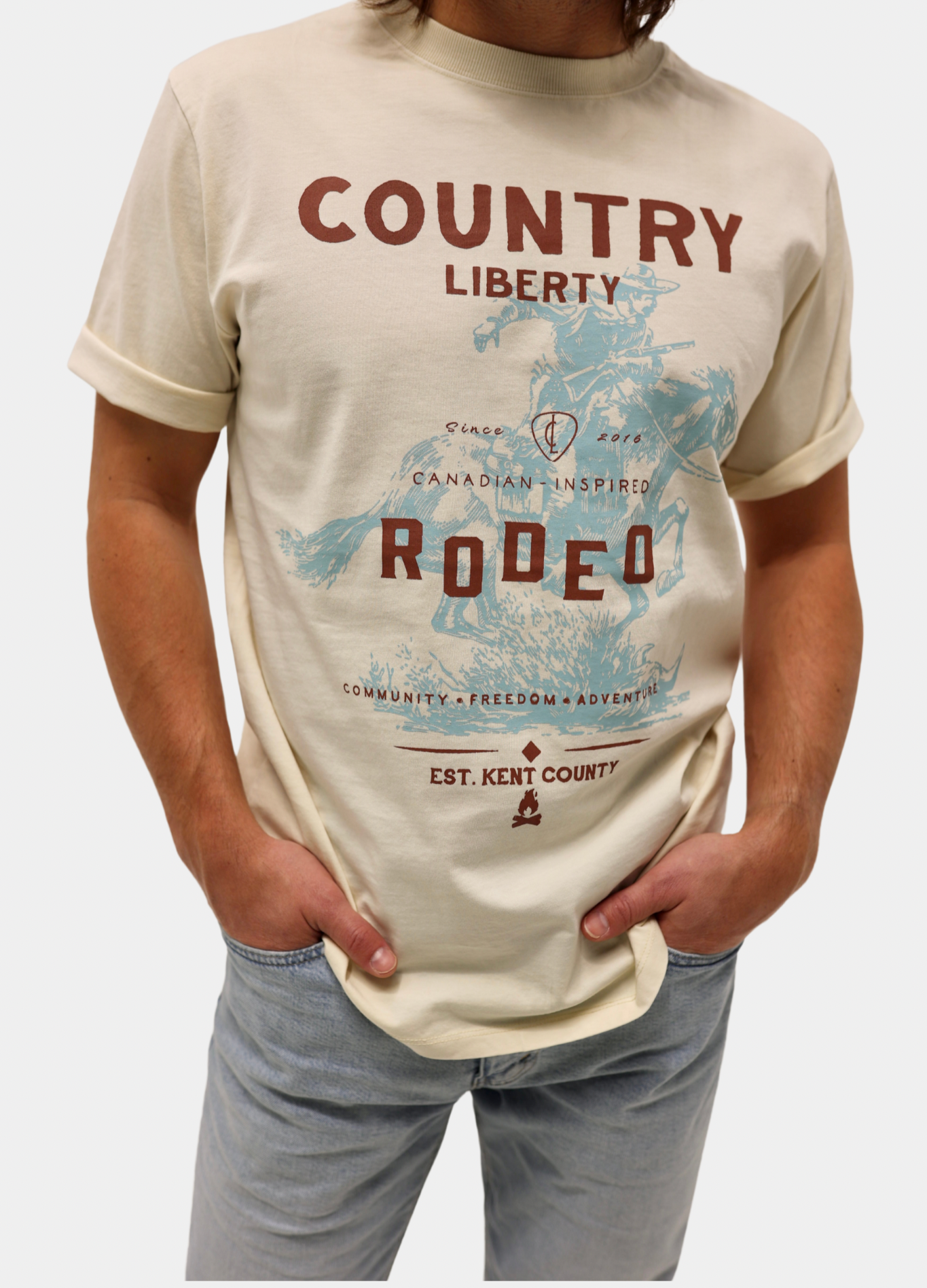 Inspired by classic rodeo posters and small-town grit, this tee captures the spirit of adventure with a distressed graphic design, bronc overlay, and signature country liberty type.