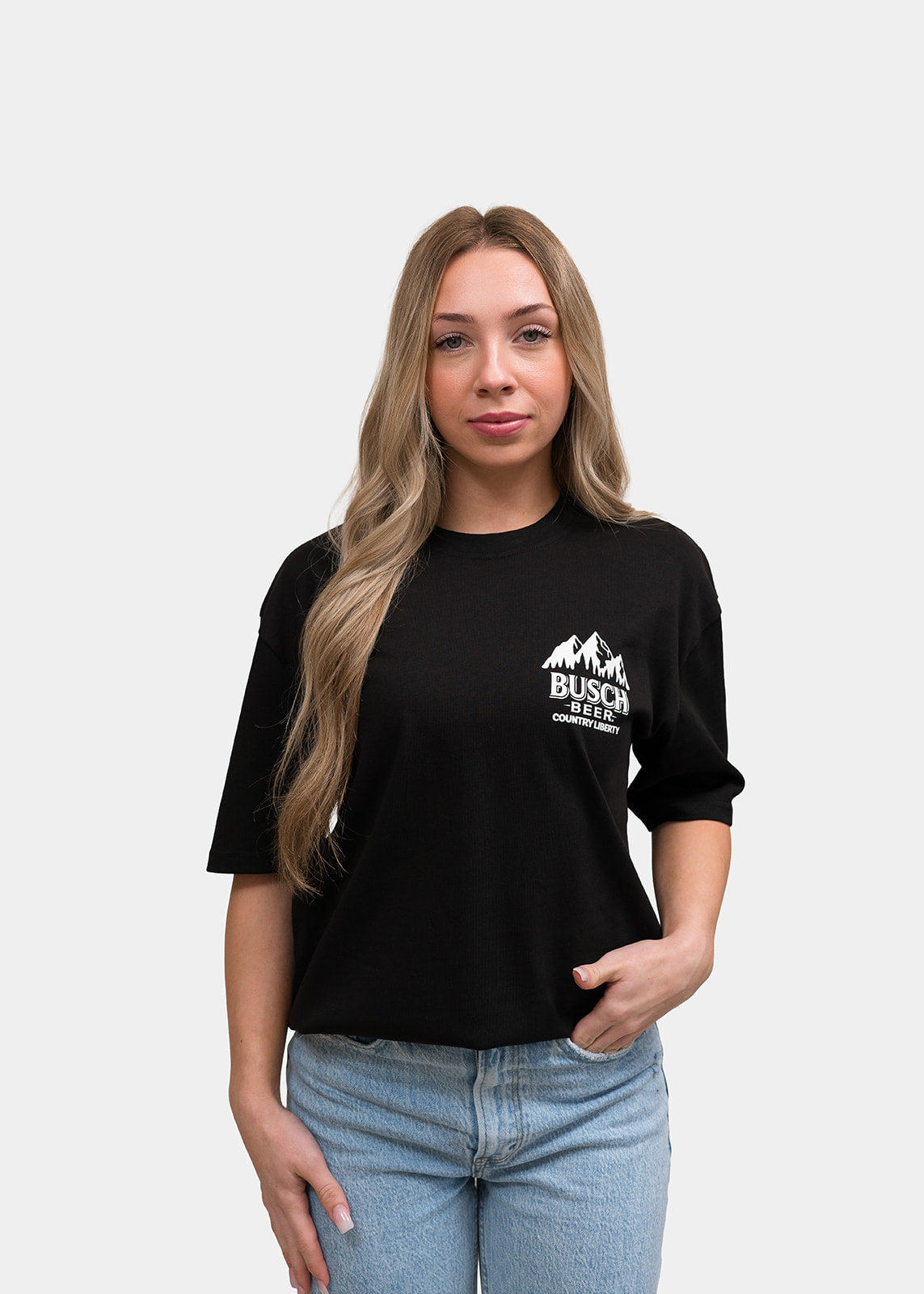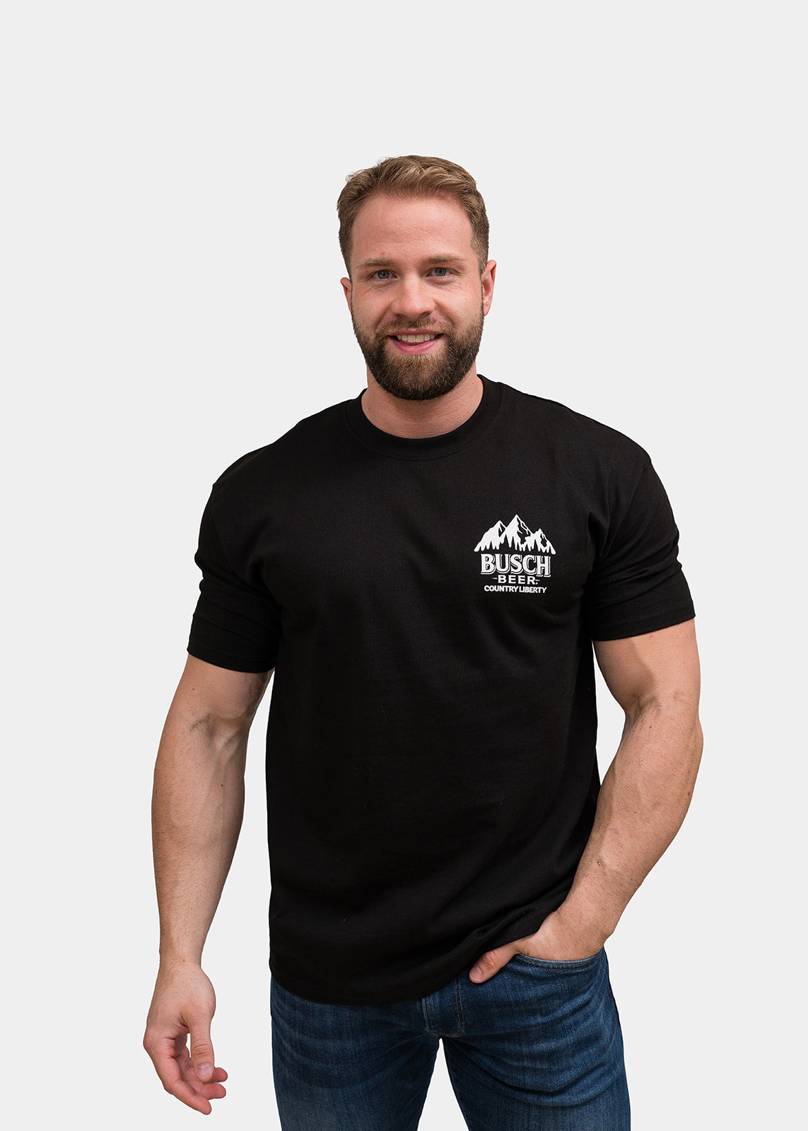 Bold, rugged, and ready for anything. Country Liberty x Busch Black Tee brings together Busch's iconic edge with Country Liberty’s country roots. Featuring a subtle graphic on soft black cotton, this collab tee is made for good times and cold drinks.