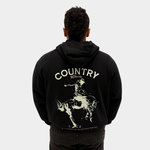 A nod to dusty posters and old-school rodeos, this hoodie features a timeless bronc rider graphic with country liberty arched overhead. Black canvas, cream ink, pure country.