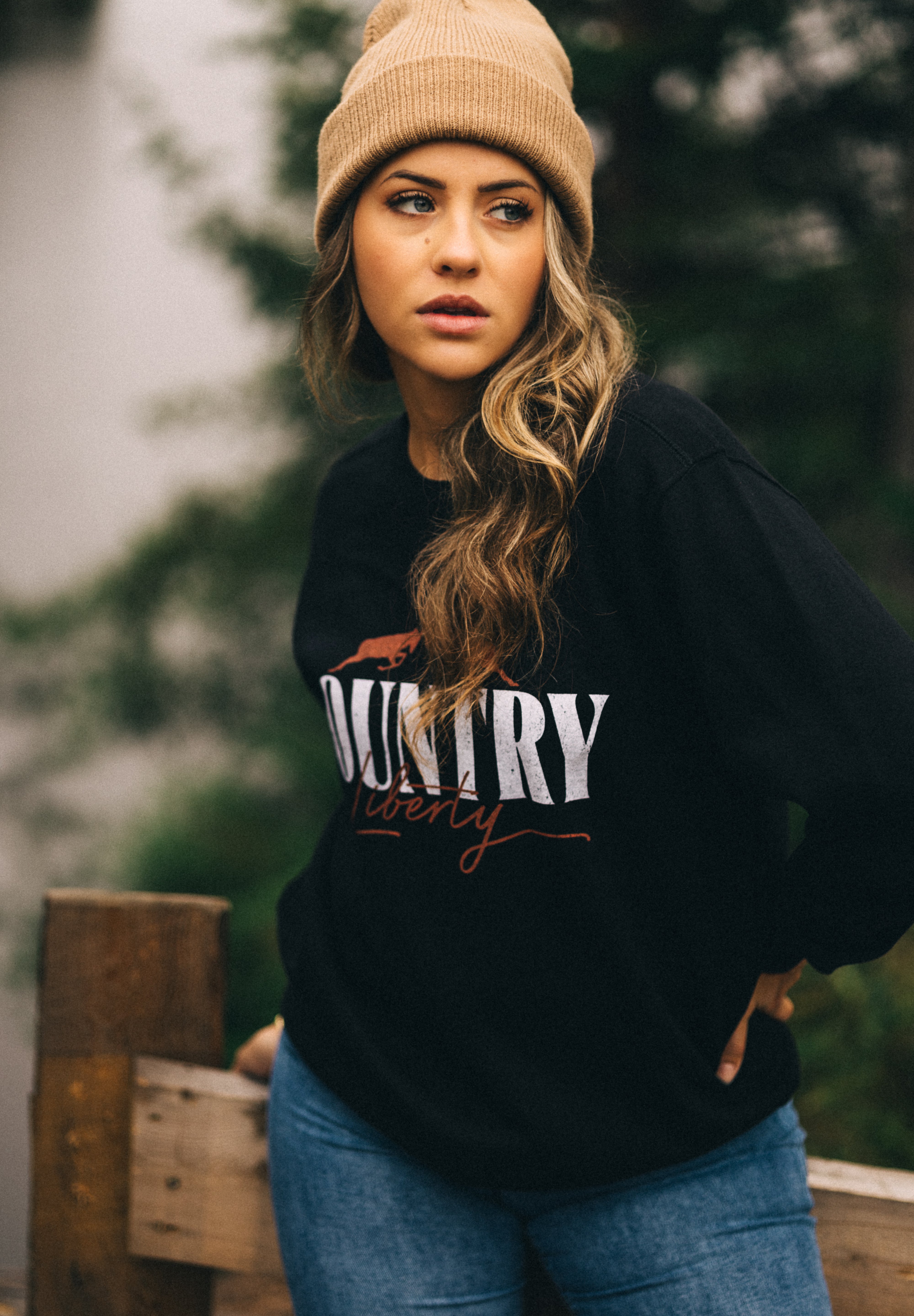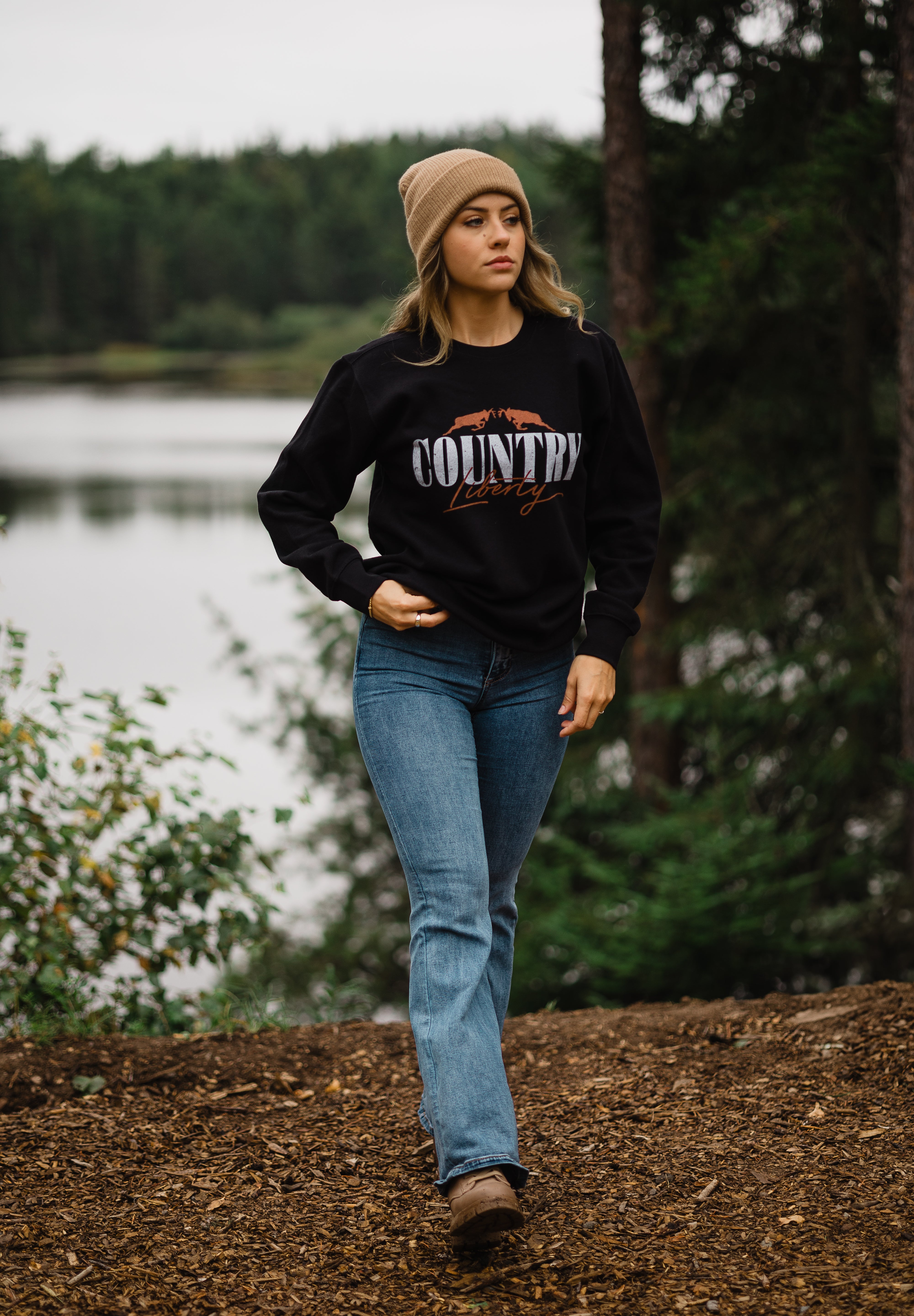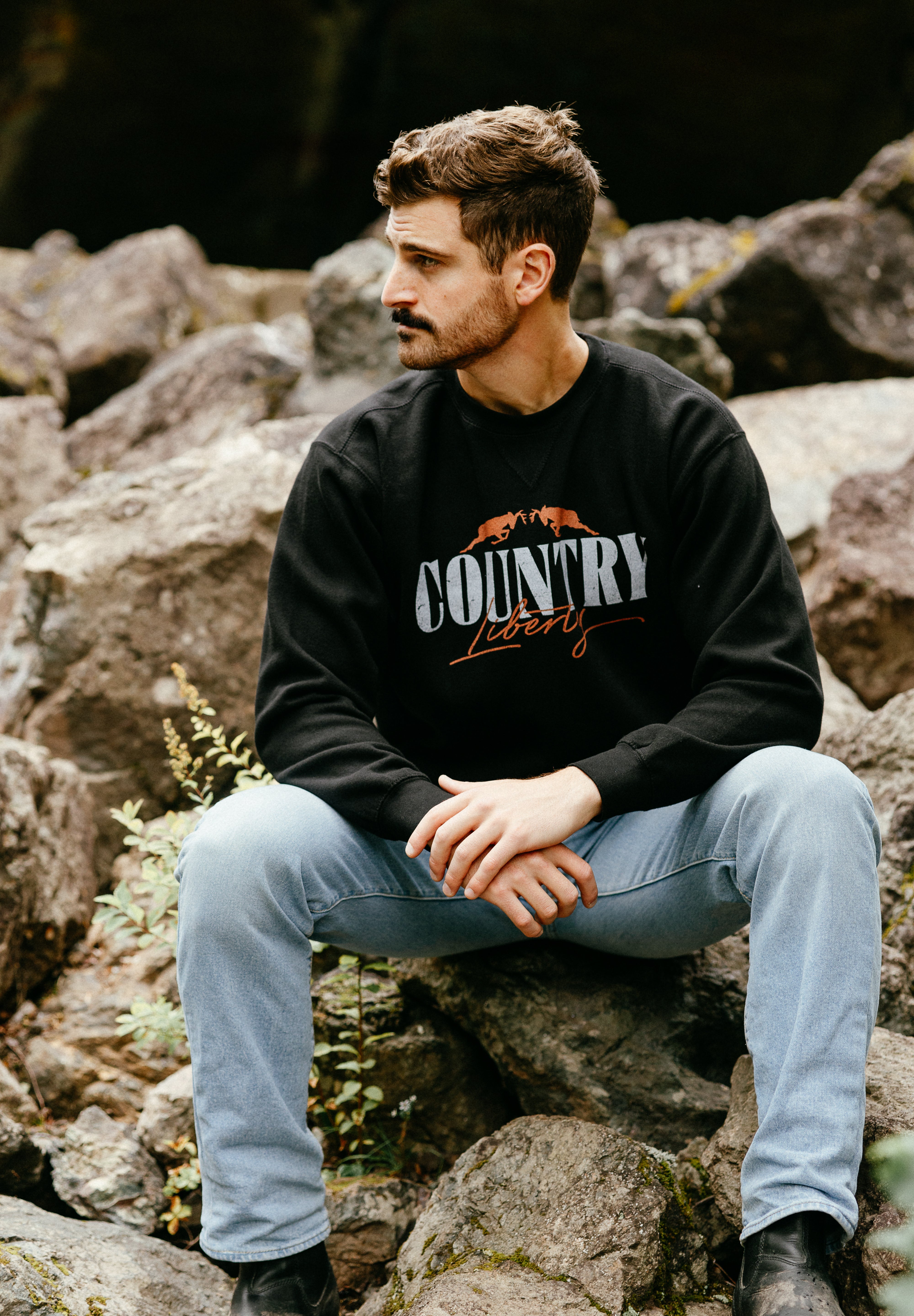 Perfect for festival season, this vintage inspired black crewneck features country-themed lettering and a worn in feel. A go-to piece for anyone who likes their festival gear with a bit of old-school character.