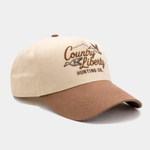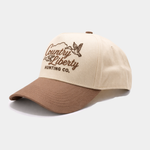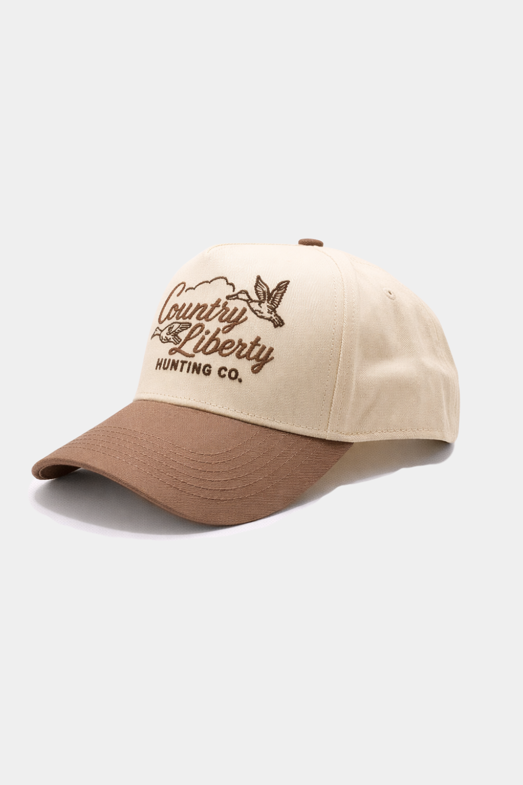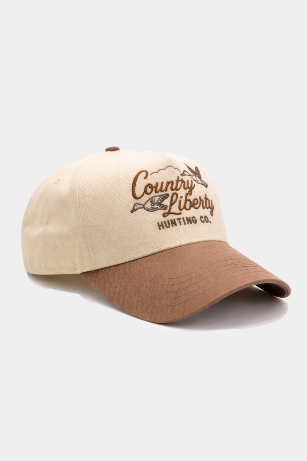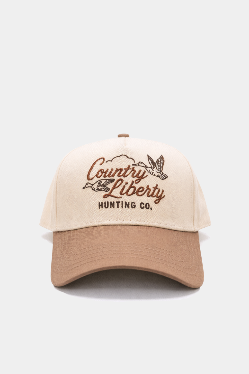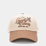 Inspired by tree stands, early alarms, and the sound of wings overhead, this two-tone hat features a camo bill, flying duck graphic, and Country Liberty Hunting Co text. Built for mornings in the blind and stories told after.
